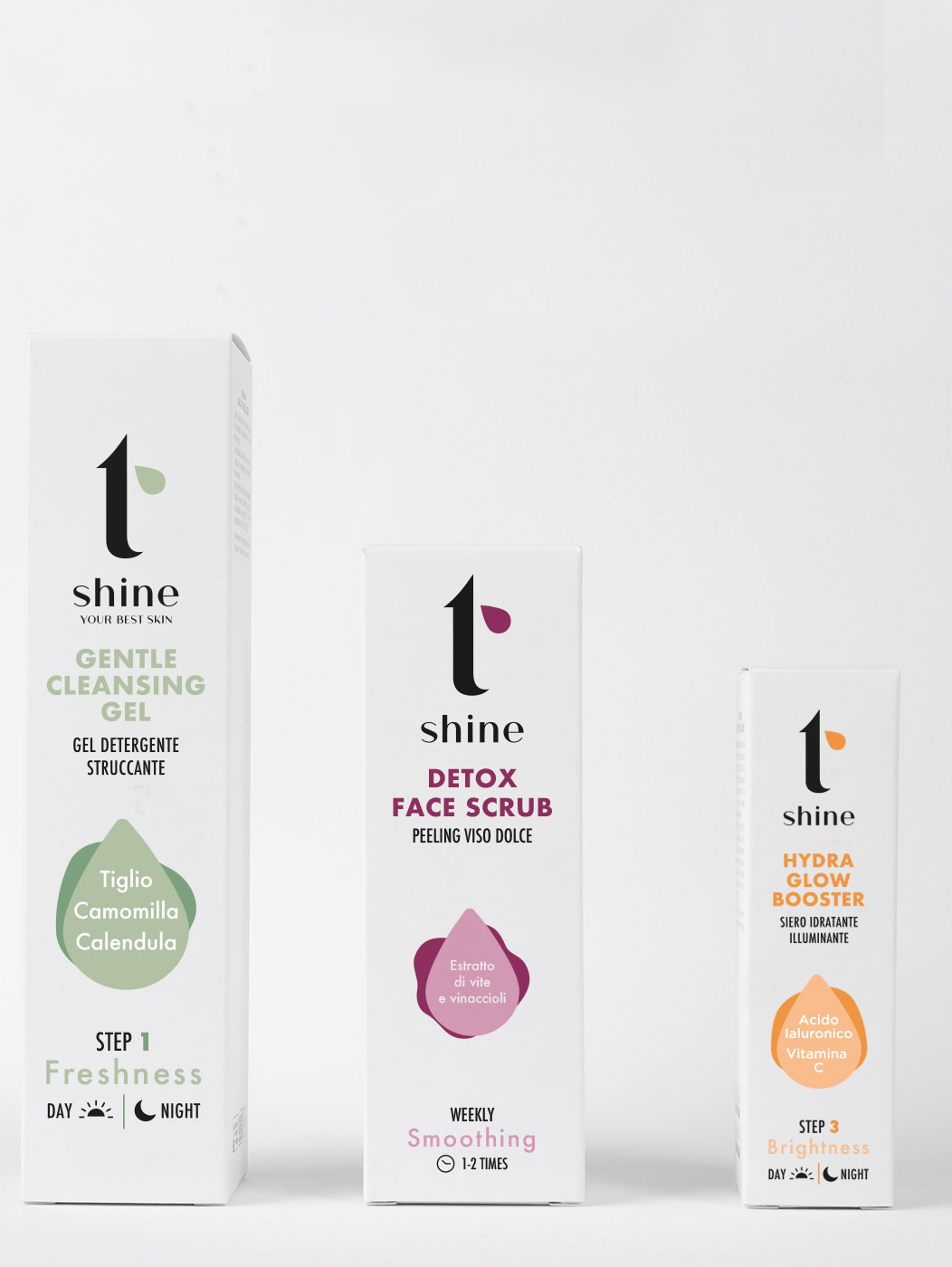 I magnifici 3 di Tshine: i tre step fondamentali per iniziare a prenderti cura della tua pelle. Il kit è formato da 3 prodotti pensati per illuminare e purificare la tua pelle.Il primo step è il Gentle CLEANSING Gel per detergere rispettando il ph della tua pelle. Secondo step è purificare con il Detox face Scrub, ideale per detossinare la tua pelle eliminando sebo e cellule morte; il terzo step è potenziare con il siero Hydraglow booster, per un’azione antiossidante e idratante in profondità.