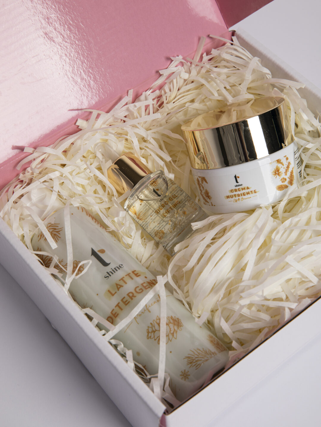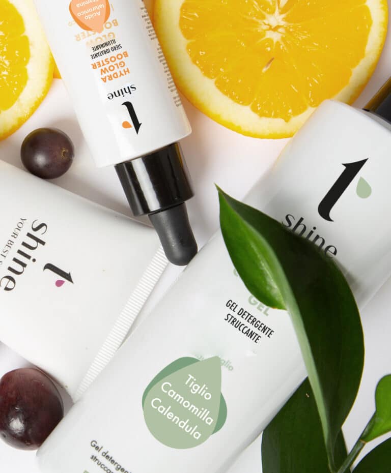 Il Kit Viso TShine! Con Latte Detergente Riequilibrante, Siero Gel Lifting a base di Acido Ialuronico e Crema Nutriente all’olio d’oliva.